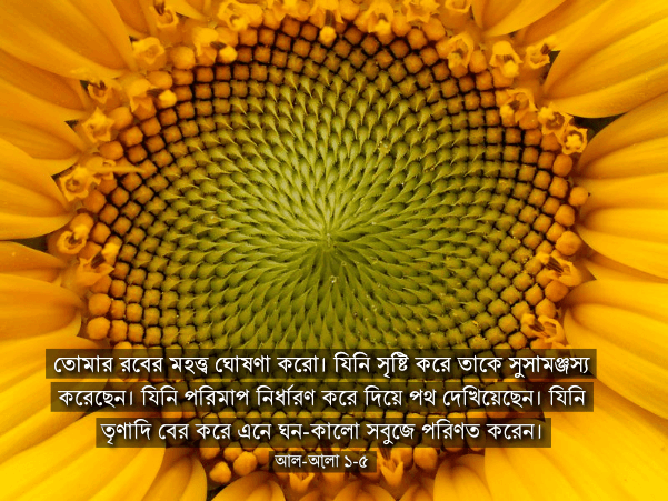 তোমার রবের মহত্ত্ব ঘোষণা করো। যিনি সৃষ্টি করে তাকে সুসামঞ্জস্যপূর্ণ করেছেন। যিনি পরিমাপ নির্ধারণ করে দিয়ে পথ দেখিয়েছেন। যিনি তৃণাদি বের করে এনে ঘন-কালো সবুজে পরিণত করেন। —আল-আ়লা ১-৫