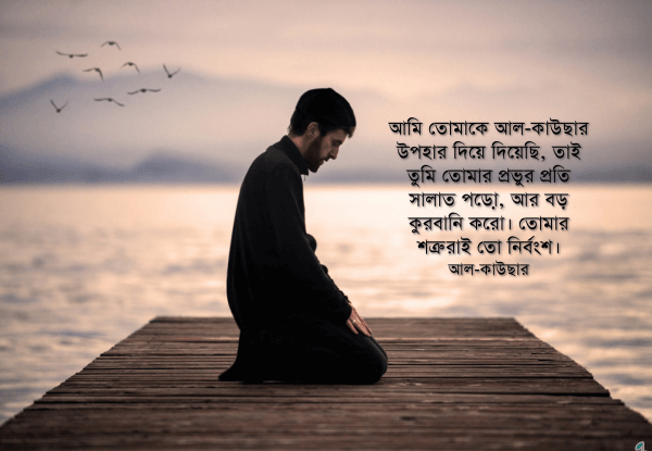 আমি তোমাকে আল-কাউছার উপহার দিয়ে দিয়েছি, তাই তুমি তোমার প্রভুর প্রতি সালাত পড়ো, আর বড় কুরবানি করো। তোমার শত্রুরাই তো নির্বংশ। [আল-কাউছার]