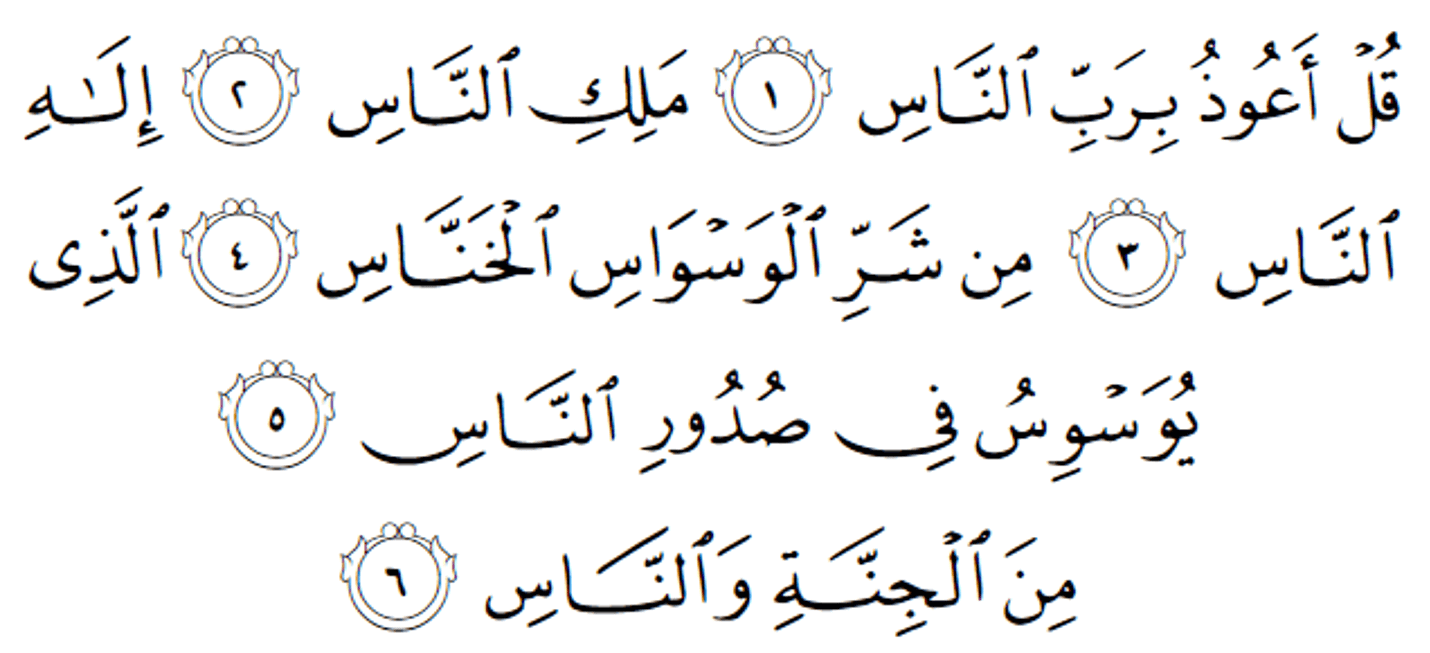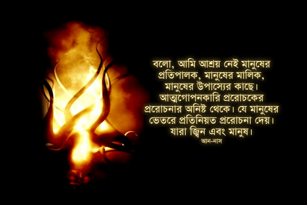 বলো, আমি আশ্রয় নেই মানুষের প্রতিপালক, মানুষের মালিক, মানুষের উপাস্যের কাছে। আত্মগোপনকারি প্ররোচকের প্ররোচনার অনিষ্ট থেকে। যে মানুষের ভেতরে প্রতিনিয়ত প্ররোচনা দেয়। যারা জ্বিন এবং মানুষ। [আন-নাস]