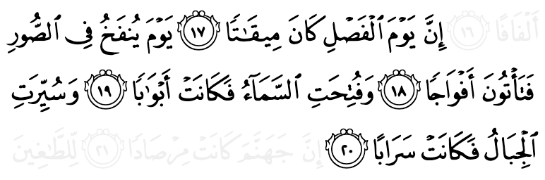 নিঃসন্দেহে সবকিছু ফয়সালার দিনটির সময় ঠিক করা আছে। সেদিন শিঙ্গায় ফুঁক দেওয়া হবে, তখন তোমরা দলে দলে আসবে। আর আকাশকে খুলে দেওয়া হবে এবং সেটা অনেকগুলো দরজার মতো হয়ে যাবে। পাহাড়গুলোকে চালিয়ে দেওয়া হবে, যেন তারা মরীচিকা—আন-নাবা ১৭-২০