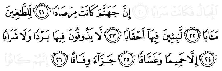 নিঃসন্দেহে জাহান্নাম ওঁত পেতে অপেক্ষা করছিল সীমালঙ্ঘকারীদের জন্য, এক স্থায়ী আবাস হয়ে। যুগ যুগ ধরে সেখানে থাকবে তারা। সেখানে কোনো ধরনের শীতলতার স্বাদ পাবে না, পাবে না কোনো পানীয়, শুধুই ফুটন্ত পানি এবং পুঁজ —উপযুক্ত প্রতিদান। —আন-নাবা ২১-২৬