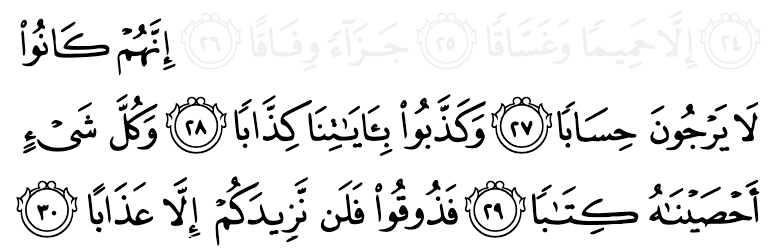 তারা ভাবতোই না যে, তাদের কাজের হিসেব কখনো দিতে হবে। আমার নিদর্শনগুলোকে সব মিথ্যা বলে প্রত্যাখ্যান করত —আমি সব গুনে গুনে হিসেব করে রেকর্ড করে রেখেছি। এবার তার প্রতিদান ভোগ করো। আমি তোমাদের শাস্তি কেবল বাড়াতেই থাকবো। —আন-নাবা ২৭-৩০