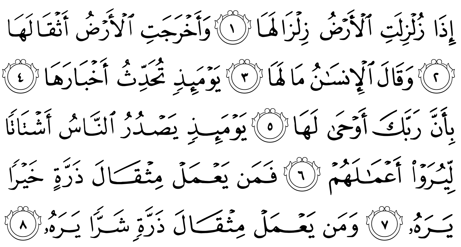 পৃথিবীকে যখন ভীষণভাবে ঝাঁকানো হবে এবং পৃথিবী তার সব বোঝা বের করে দেবে। আর মানুষ হতভম্ব হয়ে বলবে, “কী হচ্ছে এর!” সেদিন সে সবকিছু জানিয়ে দেবে, কারণ তোমার প্রতিপালক তাকে নির্দেশ দিয়েছেন। সেদিন মানুষ আলাদা আলাদাভাবে বের হবে, যাতে তাদেরকে দেখানো যায় তারা কী করেছে। তারপর কেউ অণু পরিমাণ ভালো কাজ করে থাকলেও তা দেখতে পাবে। আর কেউ অণু পরিমাণ খারাপ কাজ করে থাকলেও তা দেখতে পাবে। —আয-যালযালাহ
