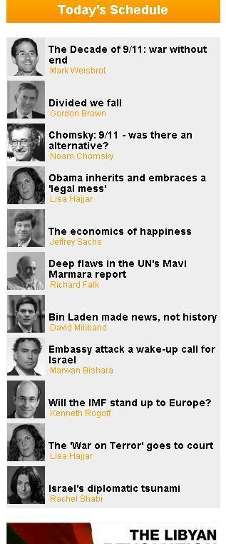 উপরের তালিকাটি আল-জাজিরার একদিনের অনুষ্ঠানগুলোর সময়সূচী। লক্ষ্য করলে দেখবেন: Weisbrot, Chomsky, Sachs, Falk, Miliband, Rogoff, Shabi এরা সবাই ইহুদি। এদের মধ্য অনেকেই ইহুদিদের বিরুদ্ধতা করলেও তাদের ইসরাইলের প্রতি বিশেষ নিরপেক্ষতা লক্ষ্য করার মত।