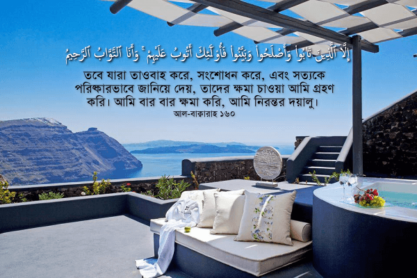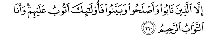 তবে যারা তাওবাহ করে, সংশোধন করে, এবং সত্যকে পরিষ্কারভাবে জানিয়ে দেয়, তাদের ক্ষমা চাওয়া আমি গ্রহণ করি। আমি বার বার ক্ষমা করি, আমি নিরন্তর দয়ালু। [আল-বাক্বারাহ ১৬০]