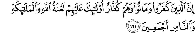 যারা ক্রমাগত অবিশ্বাস করে, তারপর সে অবস্থাতেই মারা যায়, ওদেরকে আল্লাহ অবশ্যই ঘৃণা ভরে পরিত্যাগ করেন, এবং ফেরেশতা এবং মানুষরা সবাই ওদেরকে অভিশাপ দেয়। [আল-বাক্বারাহ ১৬১]