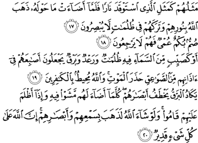 উপরের দৃশ্যগুলো এসেছে সূরা বাকারার ১৭-২০ আয়াতে: