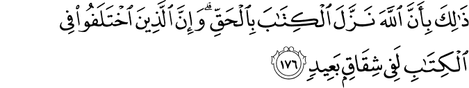 2_176তা এজন্য যে, আল্লাহ সত্য দিয়ে কিতাব নাজিল করেছেন। যারা কিতাব নিয়ে মতবিভেদ তৈরি করে, তারা ধর্মে বিভেদ তৈরিতে বহু দূর চলে গেছে। [আল-বাক্বারাহ ১৭৬]
