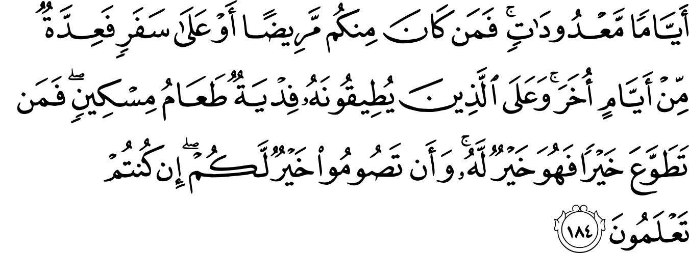 2_184রোজা নির্দিষ্ট কিছু দিন। তাই তোমাদের মধ্যে কেউ যদি অসুস্থ থাকে, বা সফরে থাকে, তাহলে পরে একই সংখ্যক দিন পূরণ করবে। আর যাদের জন্য রোজা রাখা ভীষণ কষ্টের, তাদের জন্য উপায় রয়েছে — তারা একই সংখ্যক দিন একজন গরিব মানুষকে খাওয়াবে। আর যে স্বতঃস্ফূর্তভাবে বাড়তি ভালো কাজ করে, সেটা তার জন্যই কল্যাণ হবে। রোজা রাখাটাই তোমাদের জন্যই ভালো, যদি তোমরা জানতে। [আল-বাক্বারাহ ১৮৪]