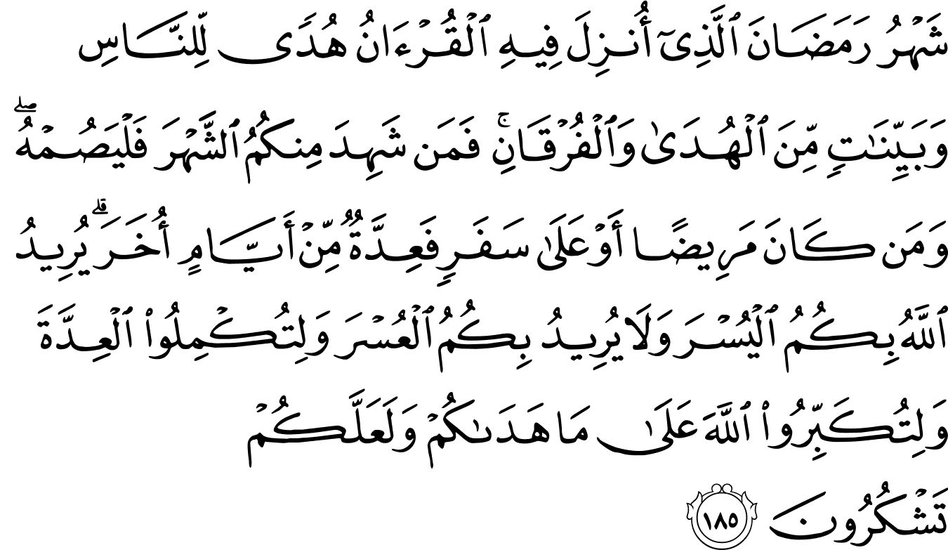 2_185রমজান মাস, যখন নাজিল হয়েছিল কুর’আন —মানুষের জন্য পথনির্দেশ, পরিস্কার বাণী যা পথ দেখায় এবং সত্য-মিথ্যার পার্থক্যকারী। তাই তোমাদের মধ্যে যে সেই মাসটি পাবে, সে যেন রোজা রাখে। আর কেউ যদি অসুস্থ থাকে, বা সফরে থাকে, তাহলে সে যেন পরে একই সংখ্যক দিন রোজা রেখে পূরণ করে নেয়। আল্লাহ তোমাদের জন্য সহজটাই চান, তিনি তোমাদের জন্য কঠিনটা চান না। তিনি চান তোমরা যেন নির্ধারিত সময় পূরণ করো, তোমাদেরকে পথ দেখানোর জন্য তাঁর শ্রেষ্ঠত্ব ঘোষণা করো, আর যেন তোমরা কৃতজ্ঞ হতে পারো। [আল-বাক্বারাহ ১৮৫]