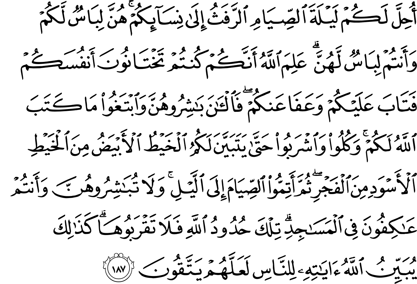 2_187রোজার রাতে স্ত্রীদের সাথে ঘনিস্ট হওয়া তোমাদের জন্য বৈধ করা হয়েছে। তারা তোমাদের পোশাক, তোমরা তাদের পোশাক। আল্লাহ জানেন যে, তোমরা নিজেদের সাথে প্রতারণা করছিলে। তাই তিনি তোমাদেরকে ক্ষমা করেছেন, তিনি তোমাদেরকে নিঃশর্তে মাফ করে দিয়েছেন। এখন তোমরা তাদের সাথে মিলিত হও, আর আল্লাহ তোমাদের জন্য যা নির্ধারণ করে রেখেছেন, তা পাওয়ার চেষ্টা করো। খাও, পান করো, যতক্ষণ না ভোরের সাদা রেখা অন্ধকারের রেখা থেকে স্পষ্টভাবে আলাদা না হয়। তারপর রাত আসা পর্যন্ত রোজা সম্পূর্ণ করো। মসজিদে ইতিকাফ করা অবস্থায় স্ত্রীদের সাথে মিলিত হবে না। এই হলো আল্লাহর দেওয়া সীমা, এর কাছেও যাবে না। এভাবে আল্লাহ তার বাণীকে মানুষের জন্য পরিস্কার করে দেন, যেন মানুষ অন্যায় থেকে নিজেকে বাঁচাতে পারে। [আল-বাক্বারাহ ১৮৭]