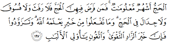 হাজ্জ নির্দিষ্ট কিছু মাসে করা যাবে। সুতরাং এই মাসগুলোতে যে তা করবে, হাজ্জে কোনো ধরনের অশ্লীলতা, নিষিদ্ধ কাজ, বা কারো সাথে ঝগড়া হতে পারবে না। আর তোমরা ভালো কাজ যা-ই করো না কেন, তার সবই আল্লাহ জানেন। হাজ্জের জন্য প্রয়োজনীয় সংস্থান সাথে নিয়ে নাও, আর সবচেয়ে ভালো সংস্থান হচ্ছে তাকওয়া। বুদ্ধিমানেরা: আমার প্রতি সাবধান! [আল-বাক্বারাহ ১৯৭]
