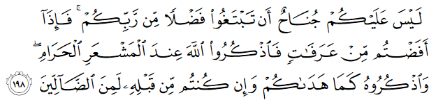 এখানে আল্লাহ عز وجل আবারো বলছেন যে, হাজ্জ করতে গিয়ে কেউ যদি ব্যবসা করে, হালাল রুজির অনুসন্ধান করে, তাহলে কোনো সমস্যা নেই। বরং অনেকের জন্য ব্যবসার একটি বড় সুযোগ হচ্ছে হাজ্জের সময়। এসময় হাজ্জি ব্যবসায়ীরা তাদের পণ্য নিয়ে এসে অন্য হাজ্জিদের মধ্যে বিক্রি করলে হাজ্জিরাই বরং উপকৃত হবে। এভাবে তারা নিজেরাও স্বয়ংসম্পূর্ণ হতে পারবে, একইসাথে অন্য হাজ্জিদেরও কাজে লাগবে।[১২][৮] তবে এই আয়াতে আল্লাহ عز وجل আদেশ করেননি, “হাজ্জের সময় তোমাদের রব্বের অনুগ্রহ অনুসন্ধান করো”, বরং তিনি বলেছেন,