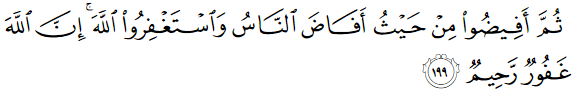 তারপর যেখান থেকে সবাই ফিরে আসে, সেখান থেকে ঢলের মতো নেমে আসো। আল্লাহরকাছে ক্ষমা চাও। অবশ্যই আল্লাহ অনেক ক্ষমা করেন, নিরন্তর করুণাময়। [আল-বাক্বারাহ ১৯৯]