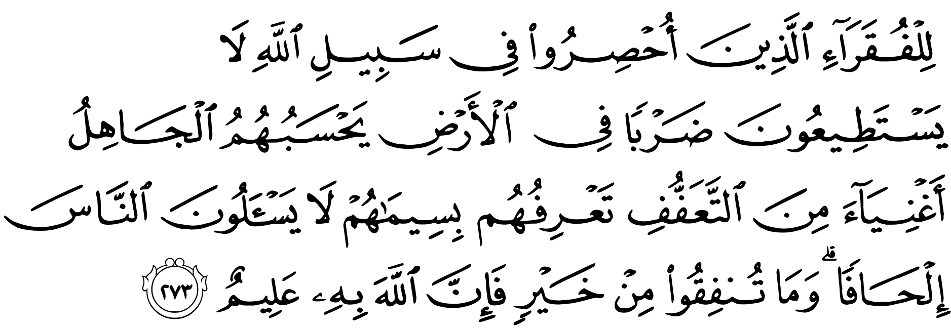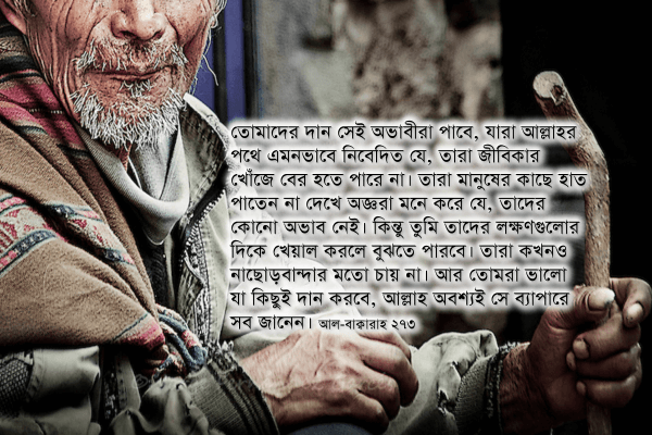 তোমাদের দান সেই অভাবীরা পাবে, যারা আল্লাহর পথে এমনভাবে নিবেদিত যে, তারা জীবিকার খোঁজে বের হতে পারে না। তারা মানুষের কাছে হাত পাতেন না দেখে অজ্ঞরা মনে করে যে, তাদের কোনো অভাব নেই। কিন্তু তুমি তাদের লক্ষণগুলোর দিকে খেয়াল করলে বুঝতে পারবে। তারা কখনও নাছোড়বান্দার মতো চায় না। আর তোমরা ভালো যা কিছুই দান করবে, আল্লাহ অবশ্যই সে ব্যাপারে সব জানেন। [আল-বাক্বারাহ ২৭৩]