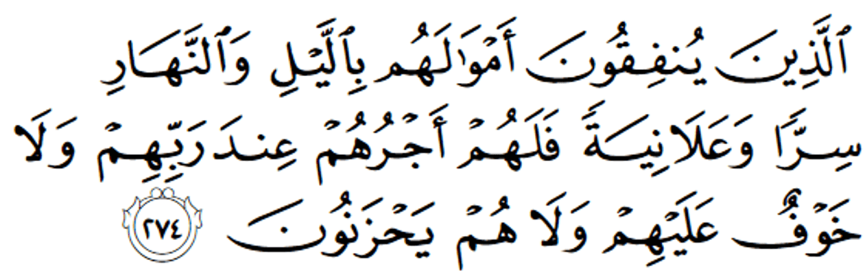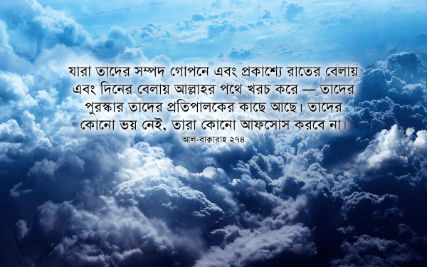 যারা তাদের সম্পদ দিন-রাত প্রকাশ্যে, গোপনে আল্লাহর পথে খরচ করে — তাদের পুরস্কার তাদের প্রতিপালকের কাছে রাখা আছে। তাদের কোনো ভয় নেই, তারা কোনো আফসোস করবে না। [আল-বাক্বারাহ ২৭৪]