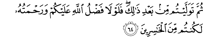 এত কিছুর পরও তোমরা (সঠিক পথ থেকে) ফিরে গেলে। যদি তোমাদের উপর আল্লাহর অনুগ্রহ এবং দয়া না থাকত, তাহলে তোমরা অবশ্যই সব হারিয়ে ফেলতে। [আল-বাক্বারাহ ৬৪]