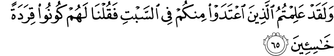 তোমরা তো জানোই, তোমাদের মধ্যে যারা শনিবারের ব্যাপারে নিষেধ ভেঙ্গেছিল, ওদের কী হয়েছিল। আমি ওদেরকে বলেছিলাম, “বানর/গরিলা হয়ে যাও তোমরা !  বিশ্রী-বিতাড়িত-ঘৃণিত!” [আল-বাক্বারাহ ৬৫]