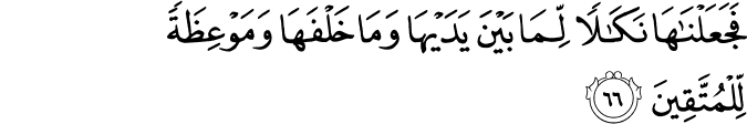 এভাবে আমি ওদেরকে এক ভয়ংকর দৃষ্টান্তে পরিণত করলাম সেই সময়কার মানুষদের জন্য এবং তাদের পরবর্তী প্রজন্মের জন্য। যারা আল্লাহর প্রতি সচেতন, তাদের সবার জন্য এটা একটা শিক্ষা নেওয়ার মতো ঘটনা। [আল-বাক্বারাহ ৬৬]