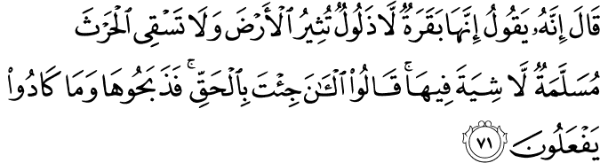 তিনি বললেন, “নিশ্চিতভাবে আল্লাহ বলেছেন, নিশ্চিতভাবে এটা এমন একটা গরু যা ক্ষেতে চাষ করতে বা পানির সেচে ব্যবহার করা হয়নি, একদম নিষ্কলঙ্ক, নিখুঁত।” তারা বলল, “এইত, এখন তুমি সঠিক তথ্য এনেছ।” তারপর তারা জবাই করল, যদিও তারা সেটা প্রায় না করার উপক্রম হয়েছিল। [আল বাক্বারাহ ৭১]