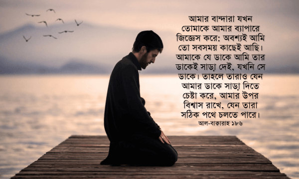 আমার বান্দারা যখন তোমাকে আমার ব্যাপারে জিজ্ঞেস করে: অবশ্যই আমি তো সবসময় কাছেই আছি। আমাকে যে ডাকে, আমি তার ডাকেই সাড়া দেই, যখনি সে ডাকে। তাহলে তারাও যেন আমার ডাকে সাড়া দিতে চেষ্টা করে, আমার উপর বিশ্বাস রাখে, যেন তারা সঠিক পথে চলতে পারে। [আল-বাক্বারাহ ১৮৬]