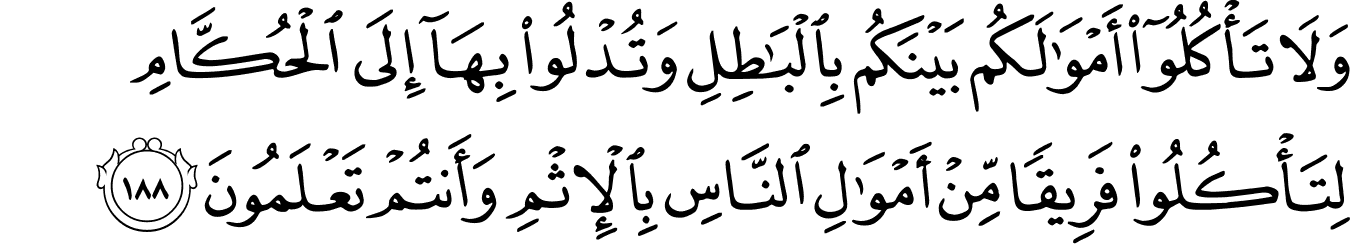 আল্লাহ تعالى এর আগের আয়াতে আমাদেরকে রোজা রেখে তাকওয়া অর্জন করার কথা বলছিলেন। এখন আসবে তাকওয়া অর্জনের সবচেয়ে বড় পরীক্ষা: আমরা কীভাবে সম্পদ ভোগ করি। কারণ মসজিদে বসে তাকওয়া দেখানো অনেক সোজা কাজ। কিন্তু মসজিদ থেকে বের হয়ে যখন আমরা চাকরি করি, ব্যবসা করি, সরকারি প্রজেক্ট হাতাই, কর্মচারীর বেতন দেই — তখন দেখা যায় আমাদের তাকওয়া আসলে কতখানি।