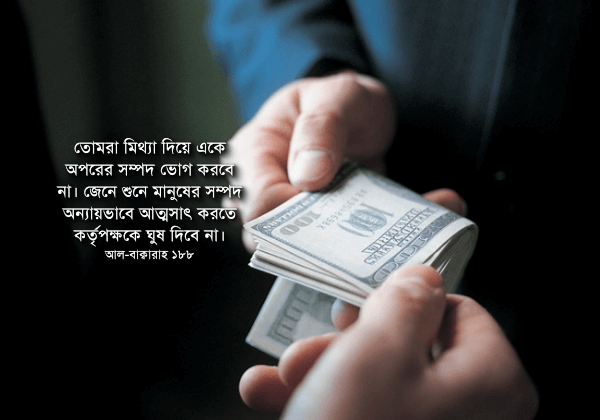 তোমরা মিথ্যা দিয়ে একে অপরের সম্পদ ভোগ করবে না। জেনে শুনে মানুষের সম্পদ অন্যায়ভাবে আত্মসাৎ করতে কর্তৃপক্ষকে ঘুষ দিবে না। [আল-বাক্বারাহ ১৮৮]