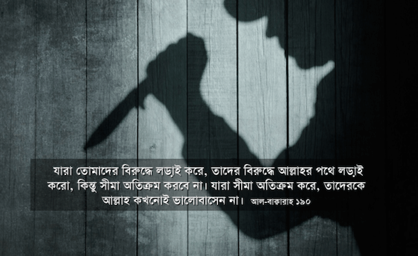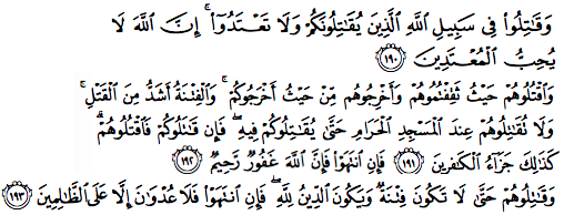 ১৯০ যারা তোমাদের বিরুদ্ধে লড়াই করে, তাদের বিরুদ্ধে আল্লাহর পথে লড়াই করো, কিন্তু সীমা অতিক্রম করবে না। যারা সীমা অতিক্রম করে, তাদেরকে আল্লাহ কখনোই ভালোবাসেন না। ১৯১ তাদেরকে যেখানে পাও সেখানেই হত্যা করো। আর সেখান থেকে বের করে দাও, যেখান থেকে ওরা তোমাদেরকে একদিন বের করে দিয়েছিল। অন্যায় বাঁধা, নির্যাতন (ফিতনা) হত্যার চেয়েও খারাপ। তবে মসজিদুল হারাম-এর কাছে ওদের সাথে লড়াই করবে না, যদি না তারা সেখানে তোমাদের সাথে লড়াই শুরু না করে। আর যদি তারা সেখানে লড়াই করেই, তাহলে তাদেরকে হত্যা করো — অবিশ্বাসীদের এটাই উচিত প্রাপ্য। ১৯২ কিন্তু ওরা যদি বন্ধ করে, তবে অবশ্যই, আল্লাহ অনেক ক্ষমা করেন, তিনি নিরন্তর দয়ালু। ১৯৩ যতক্ষণ পর্যন্ত অন্যায় বাঁধা, নির্যাতনের (ফিতনা) অবসান না হয় এবং আল্লাহর দ্বীন প্রতিষ্ঠা না হয়, ততক্ষণ পর্যন্ত লড়াই করে যাও। কিন্তু ওরা যদি বন্ধ করে, তাহলে কোনো বিরোধ থাকা যাবে না, শুধু মাত্র অন্যায়কারীদের বিরুদ্ধে ছাড়া। [আল-বাক্বারাহ]