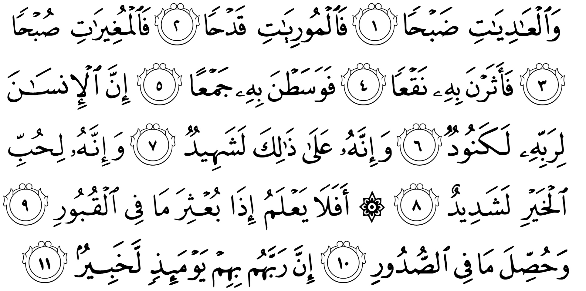আরবরা কান খাড়া করে এক রোমহর্ষক ঘটনা শুনছে। তারা কল্পনা করছে: একদল যুদ্ধের ঘোড়া ছুটে যাওয়ার জন্য অস্থির হয়ে মাটিতে পা ঠুকছে। তাদের বাঁধন ছেড়ে দেয়া হল, আর অমনি তারা তীব্র বেগে ছুটে যাওয়া শুরু করল। ছুটতে ছুটতে সবাইকে পেছনে ফেলে সামনে এগিয়ে গেল। শত্রুপক্ষকে শেষ করে যুদ্ধের ফয়সালা করে ফেলতে যাচ্ছে। তারপর…