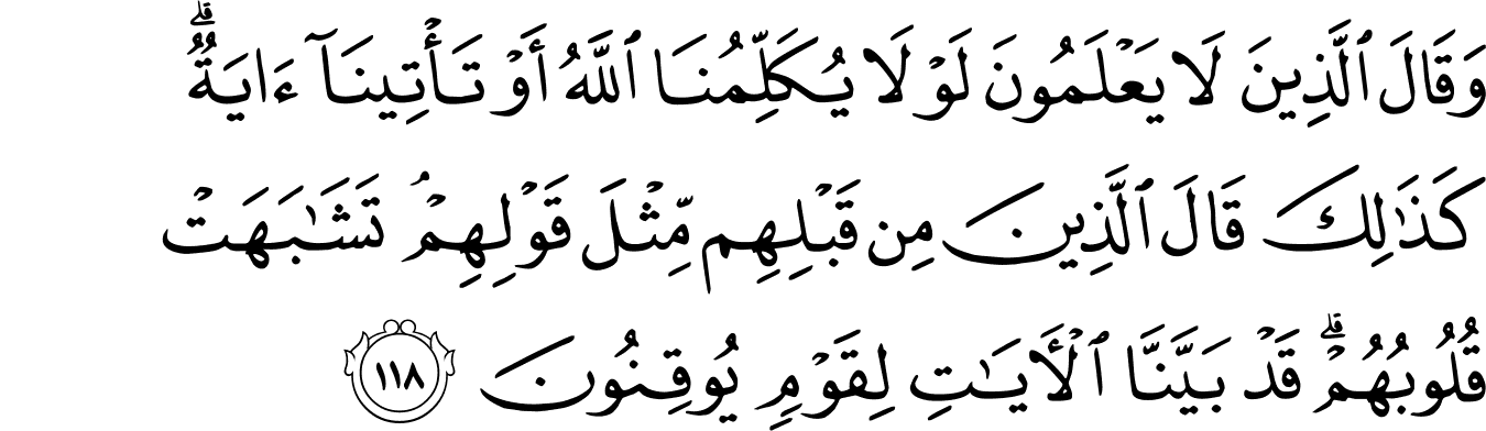 যারা বোঝে না, তারা বলে, “কেন আল্লাহ تعالى আমাদের সাথে কথা বলে না?” বা “আমাদের কাছে কোনো অলৌকিক নিদর্শন আসে না কেন?” ওদের আগের প্রজন্মও একই কথা বলে গেছে। ওদের সবার অন্তর আসলে একই রকম। আমি অবশ্যই আমার নিদর্শনগুলো যথেষ্ট পরিষ্কার করে দিয়েছি সেই সব মানুষের কাছে, যারা নিশ্চিত হতে চায়। [আল-বাক্বারাহ ১১৮]